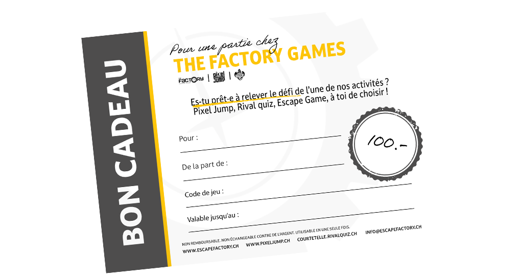 Envie de faire plaisir à vos proches avec un cadeau original et mémorable? Pas de soucis, on a ce qu’il vous faut. Offrez leur un bon cadeau pour tenter de percer les mystères de nos salles d’évasion ou de faire une partie de folie au Rival Quiz Jura